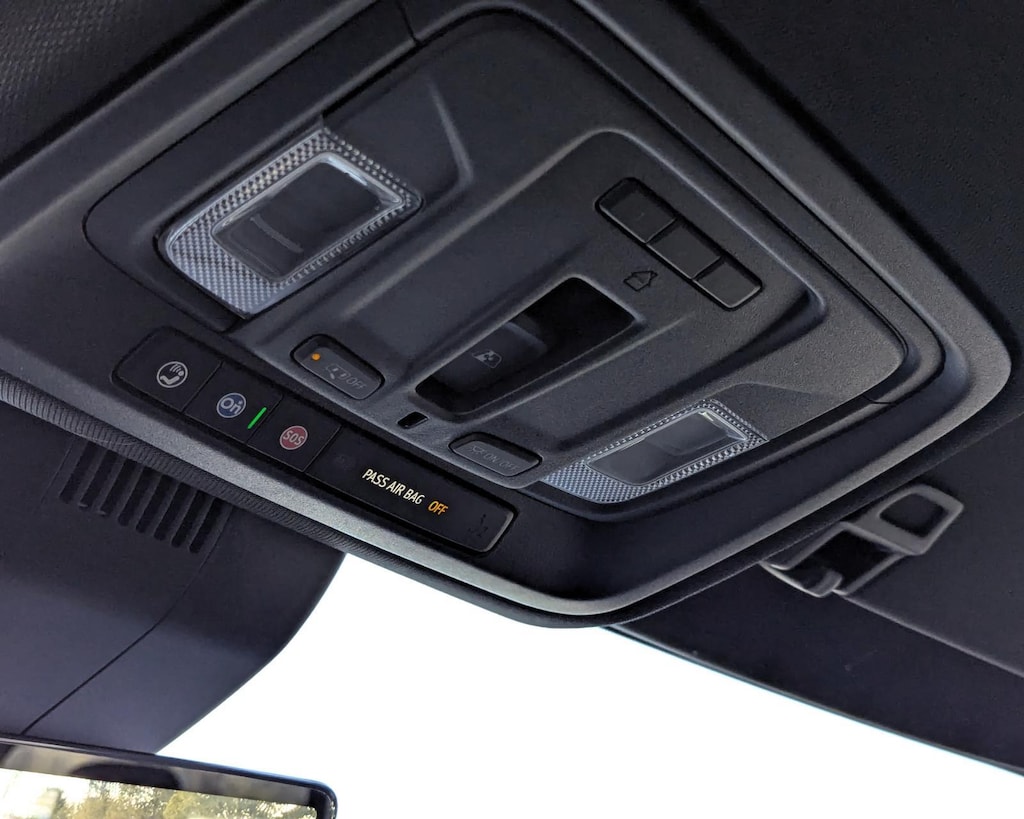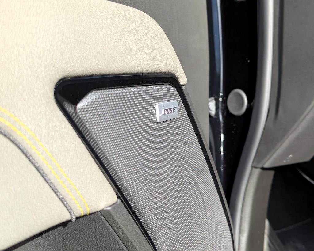 - The vehicle is equipped with a camera that displays an image of the area behind the vehicle on an interior display.